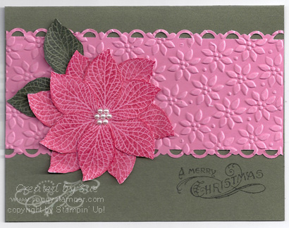 This is my all time favorite using one of the leaves from the French Foliage stamp set (120845, wood) (121166, clear) that is in the Holiday Mini catalog. You can see the details here: