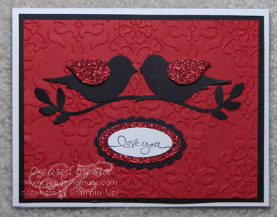 At a workshop last Sunday we made this owl card. Brynn Bolling took artistic license using the given supplies and came up with a beautiful card with the birds from the Two-Step Bird punch instead of owls. I was so impressed with the card that I recreated it here for you. I wanted to use more of the beautiful Glimmer paper so I changed the wings to glimmery red. Now we have red-winged blackbirds. :o) Thanks for the idea, Brynn!