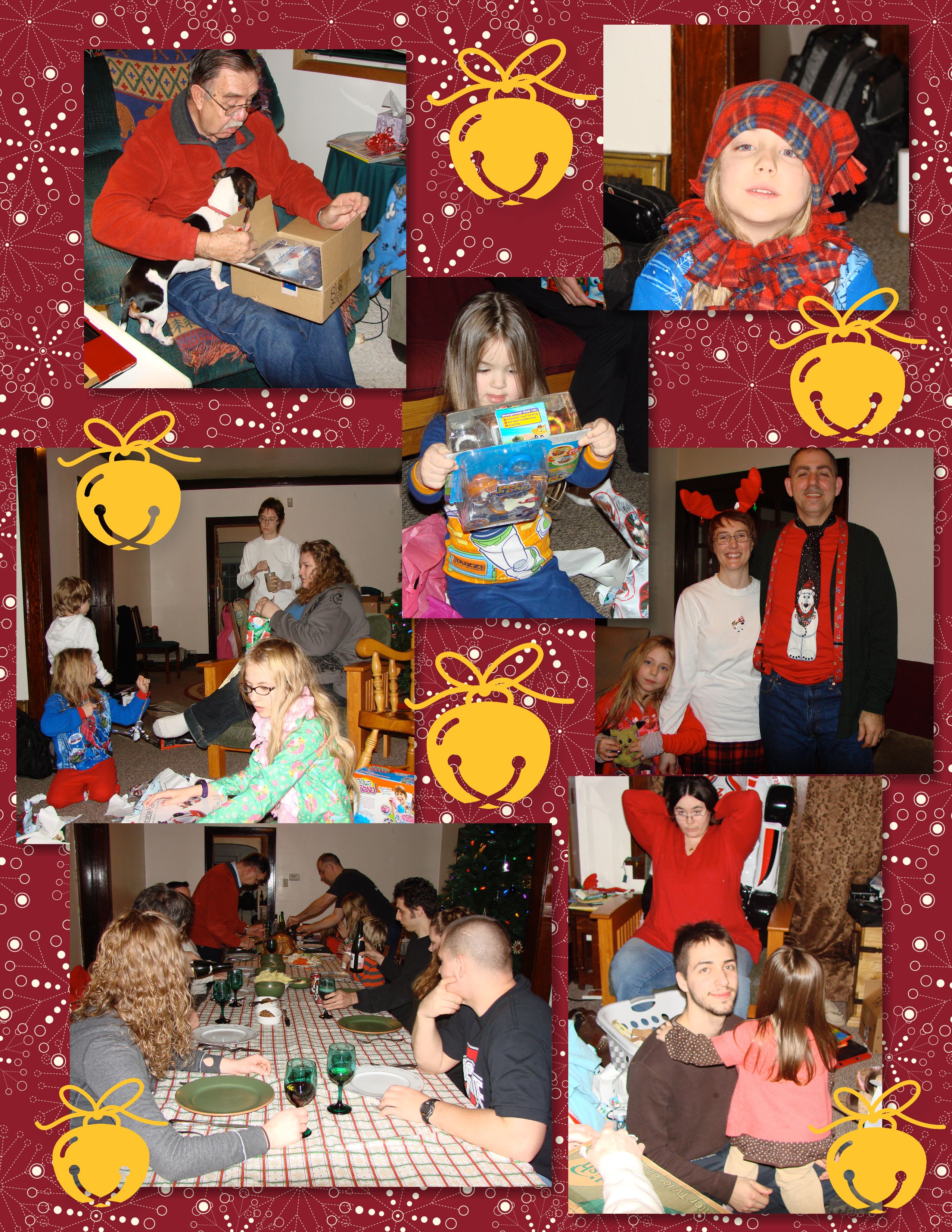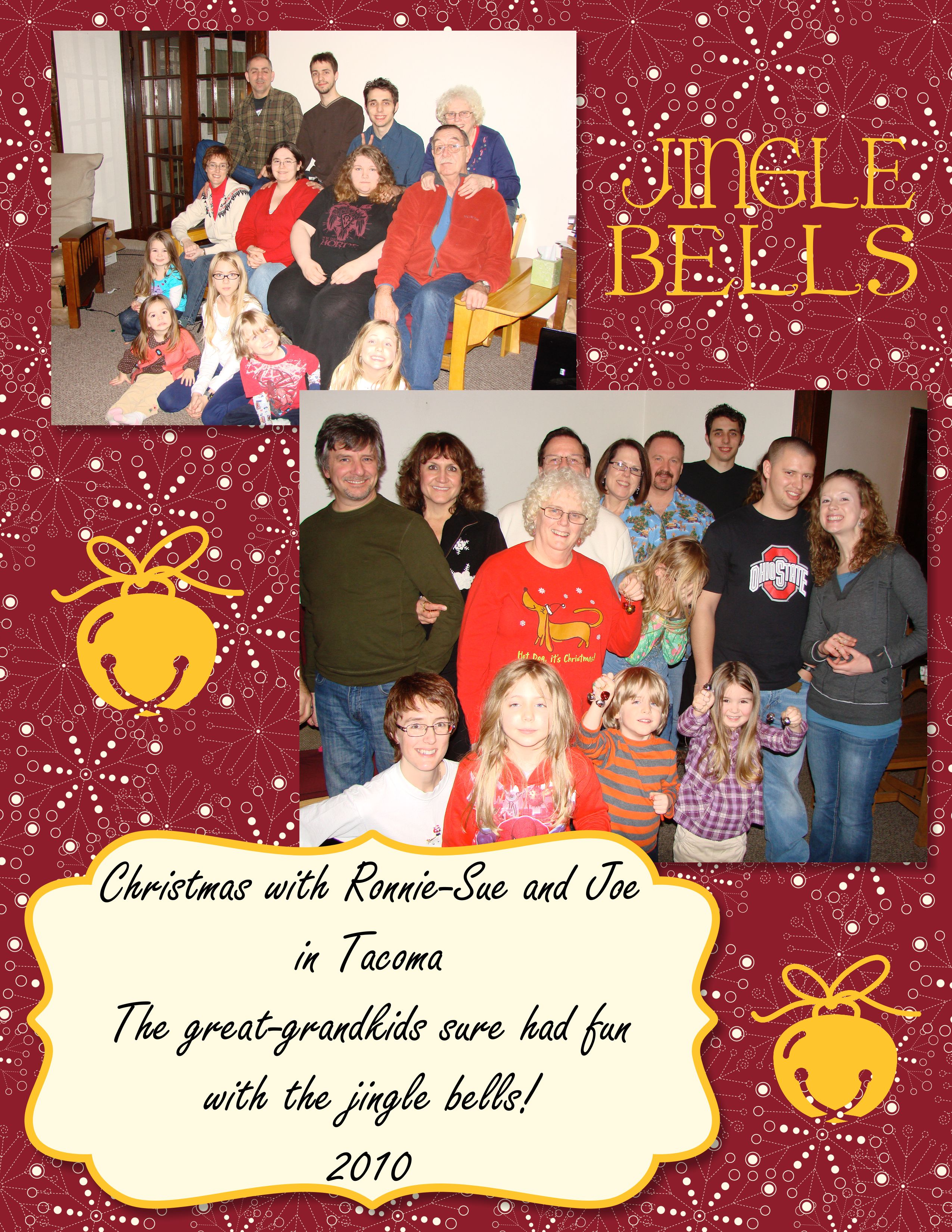 Today I have a two page digital scrapbook spread for you. We spent this Christmas with our daughter, Ronnie-Sue in Tacoma. We were blessed to be able to see all but one of our 10 grandchildren and all but two of our 7 great-grandkids. The one grandson and his family are in Germany where he is staioned with the Army. On the 26th, we had the family Christmas dinner which included several of Ronnie-Sue and Joe's friends. After dinner all of us had numerous jingle bells in our hands and we sang Jingle Bells along with an old-time video with the 'bouncing ball'. The little ones had such fun!