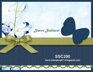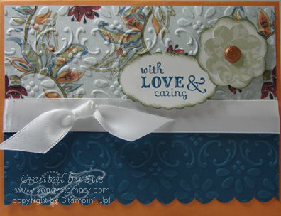 Sue — love the embossing on the DSP — Great job with the card and sketch. Thanks so much for playing along this week at Stamping 411! Blessings, Gretchen