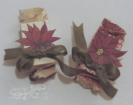 I have been playing with a new toy, the Bigz L Candy Wrapper die sold in Stampin' Up!'s Holiday mini catalog. Oh my gosh does it make easy treat wrappers or wrapping for small gifts! I used my favorite holiday designer paper, Deck the Halls, to cut out the wrappers. One of these is one side of the sheet of paper and the other has the reverse side out. I cut out a couple of the poinsettia flowers from the same sheet of paper as embellishments and tied Always Artichoke 1/2" Seam Binding around the wrapper to finish it off. What did I put inside??? Guess you will have to wait until Christmas to find out! Visit my online store to purchase the supplies to make these darling little wrappers. Thanks for stopping by and leave a comment so I know you were here.