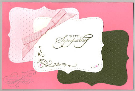 I am enjoying using the exclusive Stampin' Up! Top Note die for the Big Shot. In this card, I have cut the design out of three different colors of cardstock. I ran two of them through the Big Shot using the Cuttlebug Swiss Dot embossing folder. The Very Vanilla die cut is stamped with a portion of the coordinating stamp from the Sell-a-Bration 'Yummy" stamp set. I colored the part of the stamp I wanted with markers aWith watermark nd then stamped it on my die cut. Sell-a-Bration starts on Sunday and I am so excited about the choices of limited edition stamp sets, the ribbon bundle, and the designer paper that is available for free with each $50 in purchase of stamps and supplies from the new Spring/Summer 2009 Catalog and Idea Book. Contact me to place an order or click the online order button to go directly to my online store.